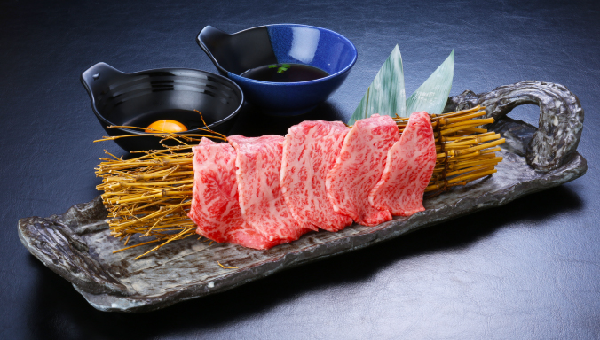 内もも下位にあるやわらかい赤身肉、軽く炙って卵とわりしたでどうぞ